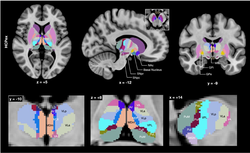 此外,HCPex在原有HCP-MMP的皮层区域的基础上,增加了总计66个新的皮下区域(每个半球有33个),其中包括丘脑核,壳核,尾状核,伏隔核,内/外侧苍白球,杏仁核,黑质质密部/网状部,腹侧被盖区,乳头体,乳头状体、中隔内核以及麦纳尔底核(nucleus basalis of Meynert)。这些区域在标准坐标空间上的定义不仅对于常见的脑认知功能和神经精神疾病等相关应用和研究十分重要,也有益于未来新增其他感兴趣的区域的图谱扩增工作(图2)。