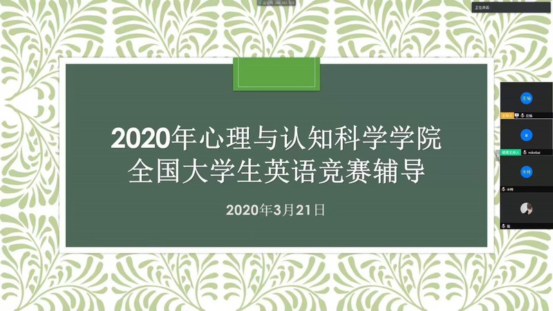 2020年3月,为提升学生的综合外语能力,心理与认知科学学院组织“全国大学生英语竞赛”专题辅导讲座,近70名同学在线上参与培训。在本次全国大学生英语竞赛初赛中,我院另有3名同学获得好成绩。