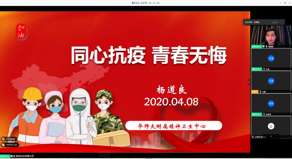 为深入学习习近平总书记给北大援鄂医疗队全体“90后”党员的回信,进一步激发广大师生党员在疫情防控中不忘初心牢记使命,48日下午,6686体育心理与认知科学学院党委举办“共抗疫情、爱国力行”爱国主义主题教育活动。活动邀请6686体育附属精神卫生中心临床一科科主任、上海市长宁区第二批援鄂医疗队负责人杨道良主任作《同心抗疫,青春无悔——6686体育附属精神卫生中心援鄂人的故事》主题报告。学院全体师生党员近200人在线参加了本次集体学习。报告会由学院党委副书记兼副院长庄瑜主持。