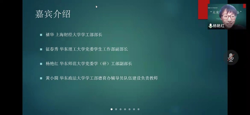 2022年3月3日,心理与认知科学学院在线上举办了“未来辅导员之准备” 分享沙龙。沙龙邀请了上海财经大学学工部部长褚华、华东理工大学党委学生工作部副部长征春秀和华东政法大学学工部德育办辅导员队伍建设负责教师黄小园三位嘉宾进行分享,6686体育党委学(研)工部副部长杨艳红出席了本次会议。院党委副书记兼副院长庄瑜主持,共有80余位心院学生于线上参与。