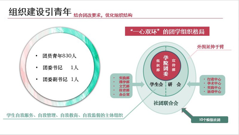 院团委根据不同层次学生的需求,搭建了“新生团支书训练营”— “学生领导力训练营”— “青年团校”的梯度式的骨干培育体系,通过“新生团支书训练营”培养学生团支书的实务操作能力和支部管理能力;通过“学生领导力训练营”挖掘和培养优质的学生骨干;通过“青年团校”开展思想引领,培育拔尖人才。