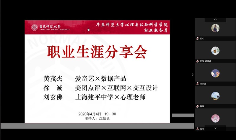 44日,心理与认知科学学院通过腾讯会议APP,举办了就业服务月的系列活动——“职业生涯分享会”。本次分享会由学院学生事务挂职干部沈怡廷老师主持,邀请学院的往届优秀毕业生作为嘉宾,旨在引导低年级同学思考心理学的就业方向及职业规划,2个多小时的活动, 130余名学生共同参与。