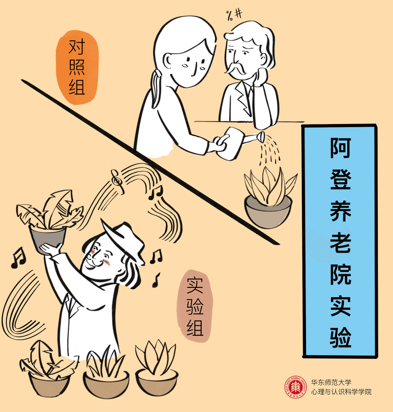 【心理学实验2:阿登养老院实验】美国心理学家艾伦.兰格等将养老院的老人分为实验组和对照组,实验组老人可以选择自主决定生活中的一些改变并对自己的生活加以控制(例如,决定是否要一盆盆栽以及选择哪一盆植物,并要自己照顾植物),控制组老人则被分发一盆盆栽并有专人负责照料,一段时间后,提升了控制感的实验组老人明显比对照组老人感到更快乐,并更主动参与公共活动。