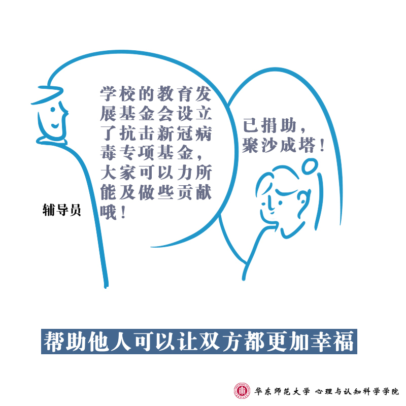 在面向全社会提供疫情防控心理支持的同时,6686体育心理与认知科学学院的师生们也通过手绘形式,向大家进行心理学知识的科普:防疫工作中,高校辅导员们每天与学生保持联系,全面了解学生的身体状况、动向并发布各类通知,系列所描述的是师生之间的互动行为所呈现的心理学意义。