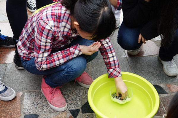 紧接着,又到了中间环节——抽签,很不幸绿队又中签了。于是,以朱舟成为首的五人小组以怪异的姿势走向正门体育馆。与此同时,第三环节正式开始!一个水盆、一只塑料盒、一带硬币,每组轮流向漂浮在水盆中的塑料盒堆放硬币直至盒子下沉。就是这样一个不带有现代电子色彩的游戏,仿佛让人回归到了童年画格子跳房子的时光,大家都投入其中。幸运的红队在这一轮中再次获胜~