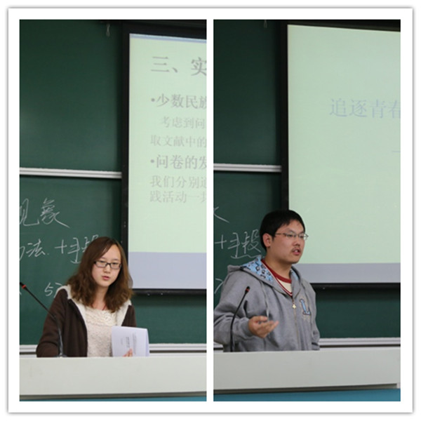 紧接着,在同学们的热切期待中,优秀实践项目的展示环节拉开了帷幕。薛寅申“青年社会组织成长探索”的介绍极富逻辑性、黄祎青“心灵护航志愿者活动”的介绍充盈着满满的爱心、吴家兴“雅安地震灾区灾后心理援助与心理干预初探项目”的介绍既带给大家震撼又夹杂着些许幽默 ,还有王启斐“青海少数民族心理认同”的介绍展现了大美青海之充满着的民族特色,刘楠楠“师道寻梦——全国中小学心理教育现状调研”的介绍体现着一名师范生的责任和严谨,陈洁“心理学职业生涯发展”的介绍则表现出一名心理学学生对于职业发展的思考。介绍期间,陶洁老师穿插点评了对每个项目的看法和意见,并告诉了我们实践活动最质朴的意义——用一双充满发现的眼睛去体验生活,然后讲诉一个“让自己感到自豪”的故事。