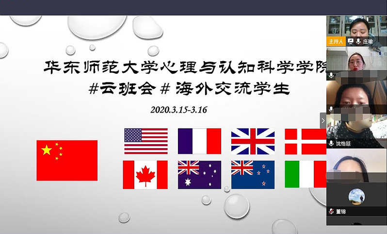 2020年3月15-16日,依据时差,心理与认知科学学院举办了两场海外交流学生“云班会”,身在8个国家的18名心院学子在云平台上相见。云班会由心理与认知科学学院党委副书记兼副院长庄瑜主持,辅导员董镕、赵菲菲、学生事务挂职干部沈怡廷一同参会。