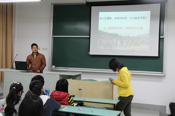 本次活动,我们荣幸地邀请到了获得华师大“自强之星”、“公益大使”的我院10级安启龙学长来为大家介绍贵州贫困山区的孩子们的学习生活状况。安启龙学长曾在2012年发起了一次对口大方县的支教活动。他给我们放映了许多体现山区孩子学习条件和家庭情况的照片,还给我们看了一小段视频。学长还表示,他希望我们可以根据实际情况认领一个或者多个孩子,给他们写明信片、写信,并与他们长期保持联系。他还强调,在给山区孩子们的信里面,更多需要的是鼓励而不是同情,要与孩子们共同成长,这将是他们走出大山的最大动力。安启龙学长的介绍引发了同学们的感动与深思。