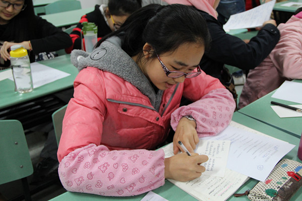 听完安启龙学长的介绍,同学们都很踊跃地认领了孩子,还有很多热心的同学认领了更多,还表示除了写明信片,也很愿意认认真真写信过去鼓励支持那群可爱的孩子们。特别是也同样来自贵州的韦欢和徐琳同学,尤为积极。教室里静静的,大家都低着头把自己的关心与爱浓缩在小小的明信片上,真诚地写下每一行字。