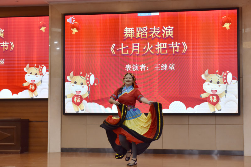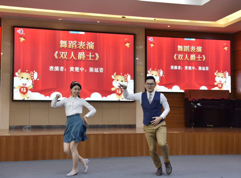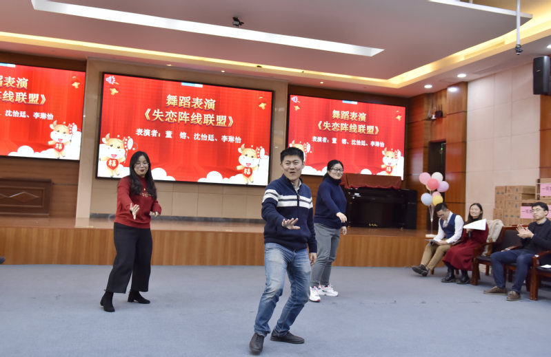 由董镕、沈怡廷和李琳怡三位老师带来的开场舞《失恋阵线联盟》拉开了本次联欢会表演的大幕,他们热情欢乐的舞蹈,点燃了联欢会的气氛。由沈怡廷老师和女儿合唱的歌曲《隐形的翅膀》,提醒着我们,即使面对困难和挑战,也要有怀着乐观和希望。“神仙眷侣”黄楚中老师和爱人一同表演的《双人爵士》舞蹈,热情洋溢,把联欢会推向了高潮。沈怡廷老师的脱口秀《奖品介绍》引发了老师们的阵阵欢笑,严文华老师带来的《可可托海的牧羊人》舞蹈讲述了发生在新疆草原上牧羊人的动人爱情故事。王兆新老师女儿的葫芦丝独奏,悠扬柔美,余音绕梁。王小雯,许心明和伊嘉怡三位老师用流利的英语为《头脑特工队》片段配音展示了现场版的“声临其境”。王继堃老师独舞的《七月火把节》,用婀娜多姿的身影带领我们穿越到云南,去领略当地的风土人情。来自上海、山东、安徽、浙江、河南、重庆、四川、黑龙江等地的老师用各自的家乡话为《乡音不改》配音让大家欣赏了语言的魅力。周宁宁和陈曦两位老师合唱一首《风吹麦浪》,优美的歌声把听众带到了秋天金色的田野里。郭家俊老师带来歌曲《夜空中最亮的星》告诉我们无论身处何地,怀着怎样的心情,都有夜空中最亮的星,陪伴且指引着我们。
