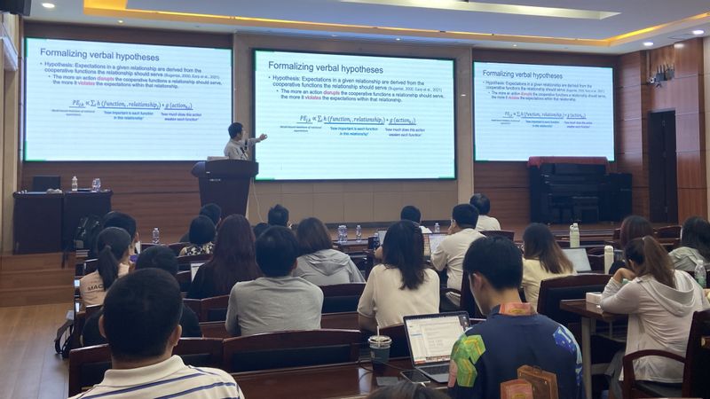 围绕“社会情感的社会属性”这一主题,于宏波博士的报告共分为两个部分展开,分享并讨论了课题组近期的研究成果。在第一部分中,于宏波博士介绍了有关社会期望违背(social expectation violation)是否以及如何诱发社会情绪的系列研究。针对这一问题,于宏波博士及合作者提出并验证了一个计算模型,该模型能够准确描述一系列不当行为在不同的人际关系(例如,情侣、室友等)下的不同社会期望违背程度。同时,在美国和中国样本中,该模型均能够准确预测行为方主观报告的内疚程度以及接受方主观报告的愤怒程度。