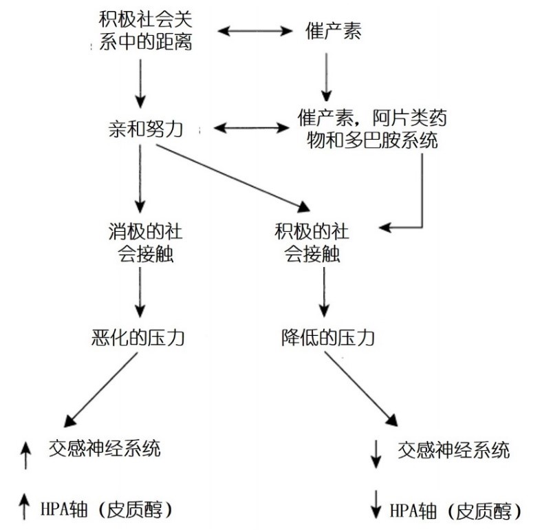 泰勒在2006年提出了压力下的亲和反应模型(model of affiliative responses to stress)。简单来说,在一段积极的社会关系中,当血浆催产素(oxytocin)的浓度升高,人们会逐渐越来越关注人际关系之间的距离。距离的疏远让人们感到不适,于是人们开始为恢复积极的社会联系而努力(亲和努力)。在这个过程中,大脑中阿片类物质(Opioids)、多巴胺系统和催产素的结合可能减少压力反应(压力激素——皮质醇浓度降低),同时削弱交感神经系统和HPA轴的活动。但是,消极的社会交往会加剧这种压力的消极作用,于是带来相反的效果。