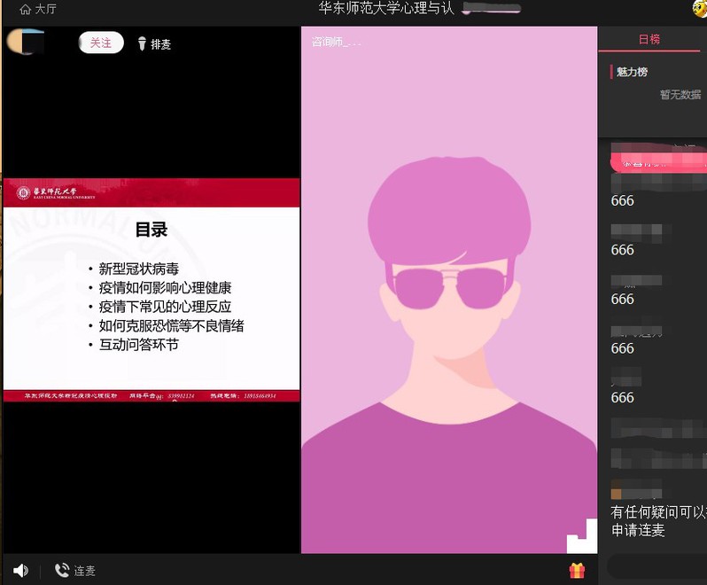 当前,新型冠状病毒肺炎感染的肺炎疫情防控阻击战全面展开,在做好医学防控工作的同时,心理层面的防控与辅导必要且重要。6686体育心理与认知科学学院发挥心理学学科优势和人才优势,开通“新冠疫情心理援助”网络平台,面向全社会开展疫情相关心理危机干预工作。全院86名师生第一时间报名参加,并着手准备网络直播平台内容:主持稿、PPT、减压操、舒缓歌曲、Q&A等,同时学院迅速安排每天的值班主播、学生志愿者和网管,上下一心,积极投入到此次社会服务中。