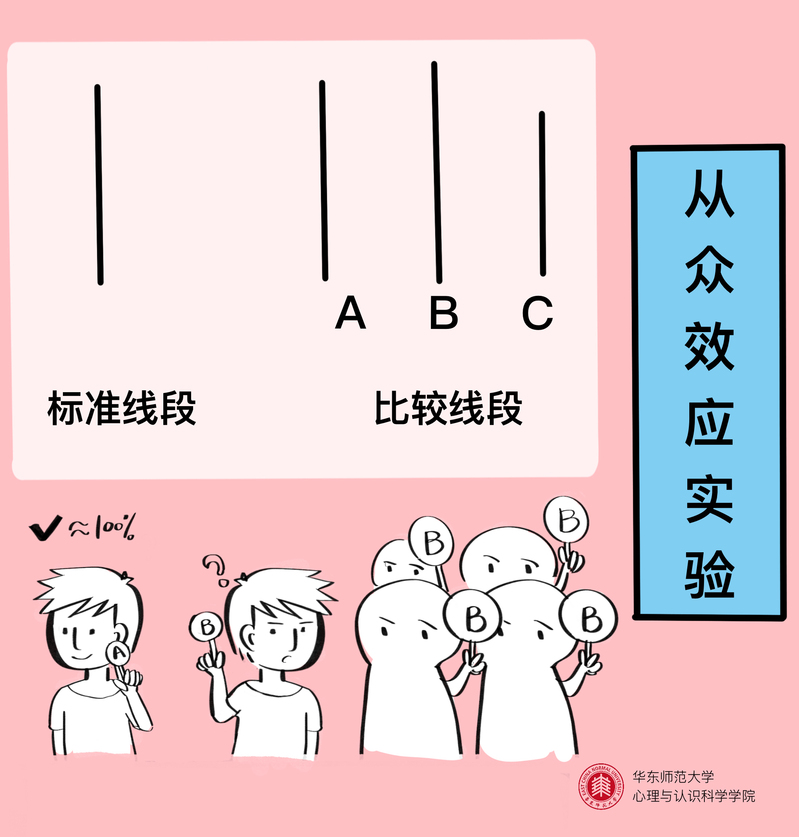 【心理学实验1:从众效应实验】美国心理学家阿希要求人们看一根线段,并从另外三根线段中选出一根与之等长的;人们直接做判断时,正确率接近100%;但如果安排在被试做判断前,有多位“假被试”均选择了一个错误选项,则真被试在进行判断时,有超过三分之一的可能性选择“随大流”而做出同样错误的选择。