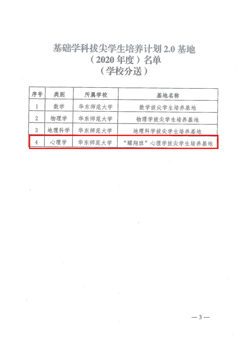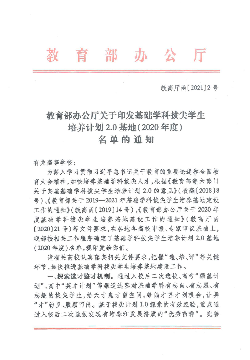 近日,教育部办公厅发布了基础学科拔尖学生培养计划2.0基地(2020年度)名单,我院“‘耀翔班’心理学拔尖学生培养基地”成功入选“国家基础科学拔尖学生培养计划2.0基地”。