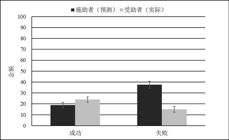 除了主观感受,研究者在金钱指标上也发现了类似效应。失败条件下,施助者预测受助者会让自己赔多少钱;成功条件下,施助者预测受助者会给自己多少钱以示感谢。受助者则给出自己的实际判断。结果发现,只有在好心帮倒忙时存在预测偏差,施助者高估了受助者的索赔金额。这说明施助者的预测偏差不仅表现在心理感受方面,也会对行为后果产生影响。