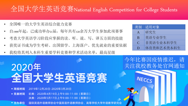 全国大学生英语竞赛(National English Competition for College Students, 简称NECCS)是经教育部有关部门批准,由教育部高等学校大学外语教学指导委员会和高等学校大学外语教学研究会联合主办的全国唯一的大学生英语综合能力竞赛。此项赛事得到了各省大学外语教学研究会和各高校师生的大力支持,每年全国共有31个省(自治区、直辖市)的千余所高校参赛,每年共有120余万大学生参加此项赛事。