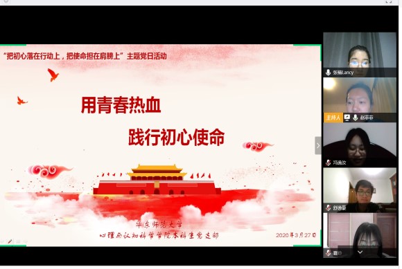 为进一步深化“不忘初心、牢记使命”主题教育成果,坚决贯彻落实学校《关于在新冠肺炎疫情防控工作中充分发挥基层党组织战斗堡垒作用和共产党员先锋模范作用的通知》精神,发扬党员冲锋在前、履职尽责、主动作为、勇于担当的精神,3月份以来,心理与认知科学学院党委组织师生党员深入学习贯彻习近平总书记关于疫情防控工作的重要讲话和指示精神,指导各党支部联系实际围绕“把初心落在行动上、把使命担在肩膀上”主题开展线上主题党日活动。