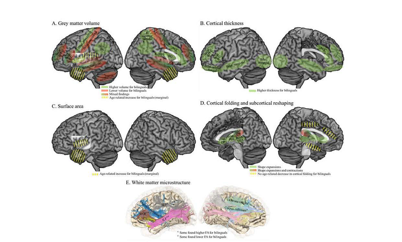 图4.双语经历对脑结构的影响概况(双语者与单语者之间有差异的区域)。A-D.灰质体积。B.皮层厚度。C.皮层表面积。D.皮层折叠。E.白质纤维束微观结构。