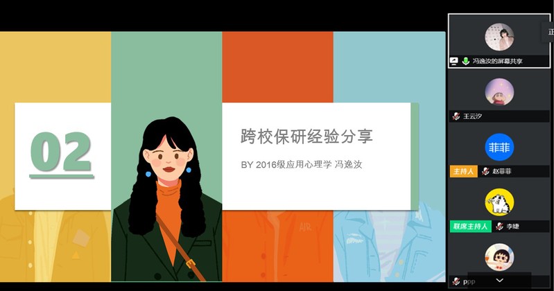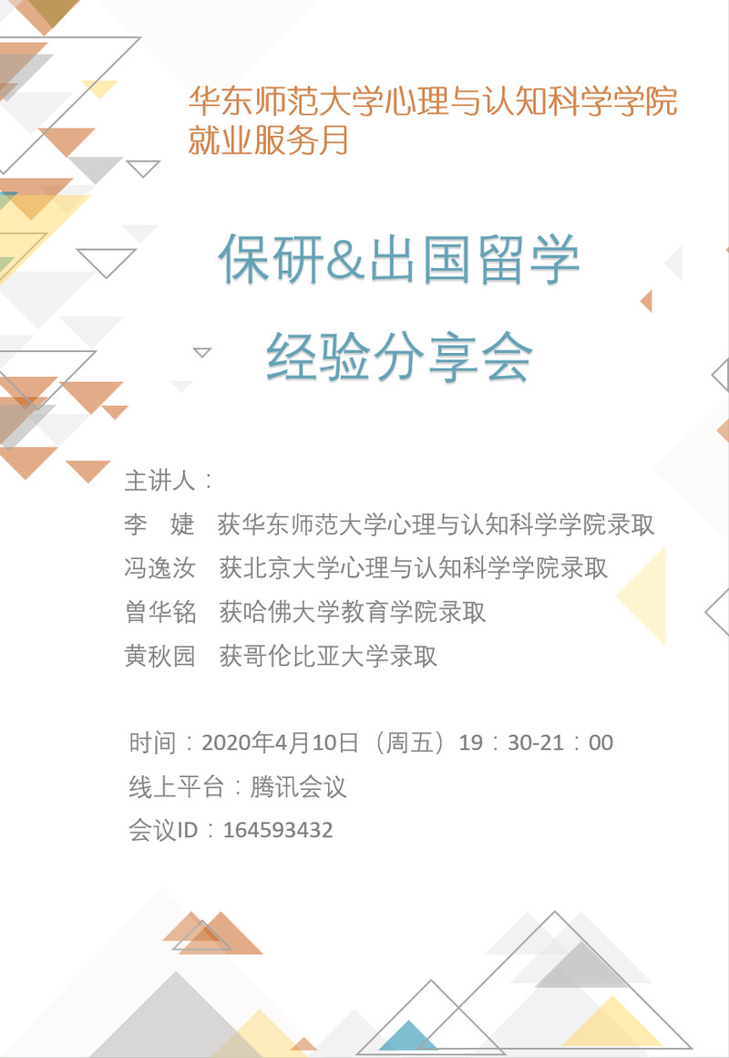 4月10日,心理与认知科学学院通过腾讯会议APP,面向全体本科生举办了就业服务月的系列活动——“保研&出国留学经验分享会”。