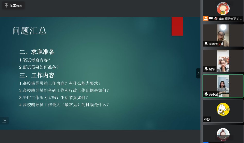 沙龙伊始,杨艳红表达了6686体育对于辅导员队伍建设的重视,并鼓励有志于成为高校辅导员的同学们做好规划、积极准备,实现自己的职业理想。褚华、征春秀、黄小园就同学们提出的关于辅导员招聘要求、求职准备、工作内容和职业发展等问题,结合各校实际情况,进行了详细地解答。褚华提到,作为一名辅导员,需要有较高的政治素养和良好的道德品行,要热爱学生工作和教育事业,同时还要有一定的组织管理和文字表达能力。征春秀向同学们介绍了高校在招聘辅导员时的流程与考察要点,她还提醒大家要多关心时事热点,学习党的最新文件精神等,有很大帮助。黄小园在介绍辅导员工作时谈到,辅导员工作涉及的方面很多,需要有耐心、细心和一定心理承受能力。但同时,这也不失为一个锻炼、成长的机会,可以为以后自身的发展打下基础。