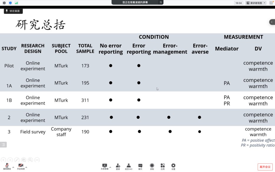 凌斌老师报告了自己近期对差错报告的人际结果的研究,从个体层面中的差错报告接收者或评价者的视角切入,围绕差错报告是如何影响人际评价结果,以及如何影响人际评价的理论边界?两个问题进行探讨和研究。