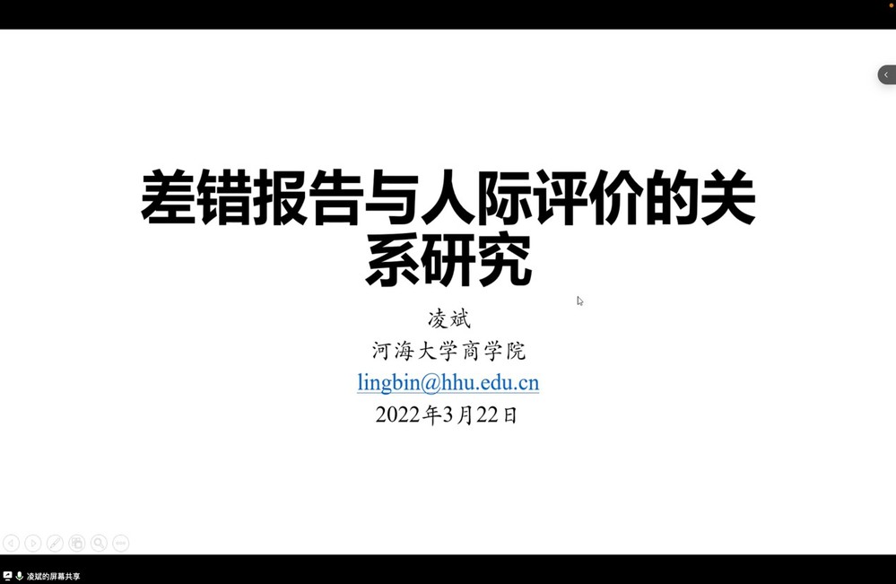 2022年3月22日,6686体育心理与认知科学学院举办的俊秀青年学术俱乐部系列讲座如期举行。河海大学商学院凌斌副教授应邀以“差错报告与人际评价的关系研究”为主题,通过腾讯会议的方式与所有参会者交流互动。本次讲座由6686体育心理与认知科学学院的段锦云教授主持。约五十位对此研究感兴趣的老师和同学们参与了本次讲座。