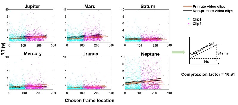 虽然以上的发现指出猕猴在时序判断的过程中可以压缩性地跳过记忆内容的细节而完成回放,但是跟人类相比,这种“心理时间旅行”(mental time travel)在猕猴上又是怎样体现出来的呢?猕猴能否如人类般灵活地以跳跃式地回到过去的任何时间点的?为了进行跨物种的对比,该研究采集了7名大学生被试进行同样的时序判断任务。