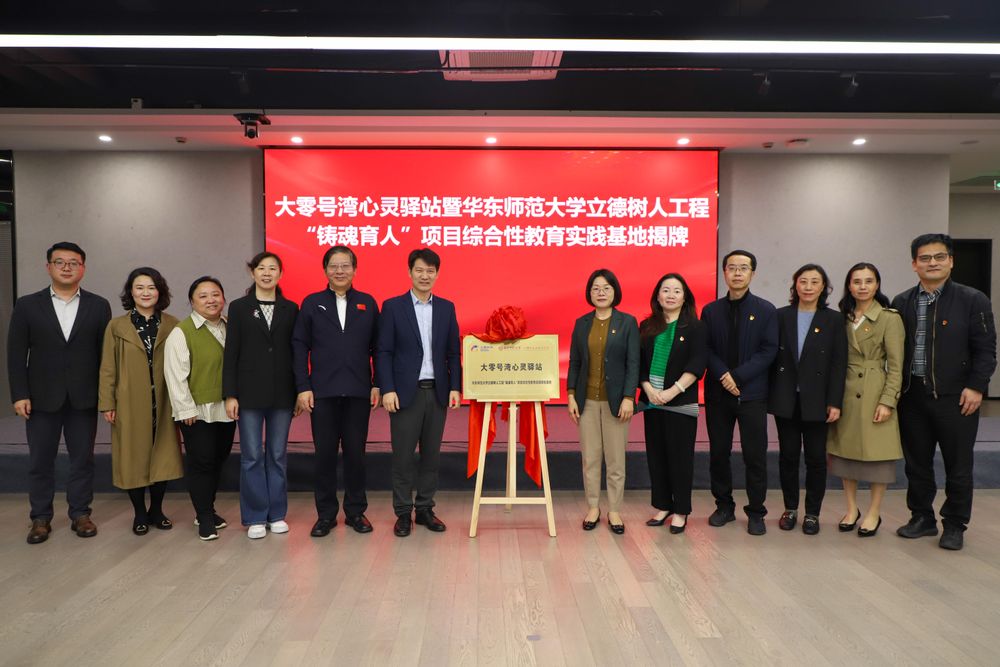 校党委常委、副校长吴健,心理与认知科学学院院长周晓林、院党委书记方媛,党委学工部副部长兼心理健康教育与咨询中心主任庄瑜,大零号湾集团党委副书记、总经理徐亚云,党委副书记倪悦婷,党委委员、纪委书记孙幸超,党委委员、副总经理叶隆、党委委员、副总经理杨晓丽,闵行区科委副主任韩晓非、闵行区高服中心负责人褚春荣、吴泾镇莲花片区党支部书记沈嘉倩、上海吴泾经济发展有限公司总经理徐佳麟等共同见证大零号湾心灵驿站暨6686体育立德树人工程“铸魂育人”项目综合性教育实践基地揭牌。