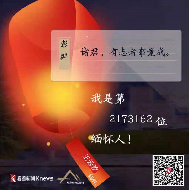 王云汐:龙华烈士纪念馆,是英雄荟萃之地,壮歌回荡之地。我们在网上祭扫先烈,阅读他们的英雄故事,回顾过去那段峥嵘岁月,学习他们无私奉献、勇于牺牲的精神。我们为先烈们点亮一盏灯,告慰英烈,也提醒自己永远铭记历史,坚定向前。