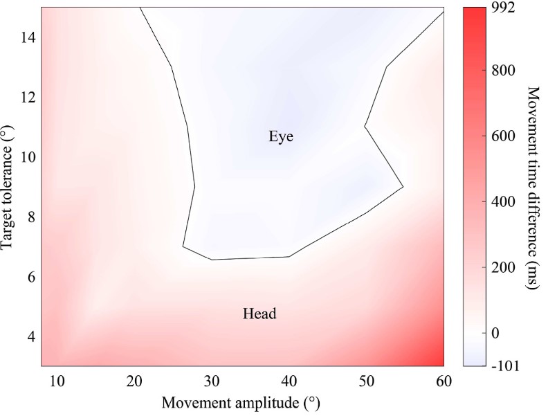 图3. 头控和眼控的总操作时间差异热图(红色区域为头控的优势区间,蓝色区域为眼控的优势区间)。