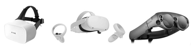 图1. 有线VR头盔FOVE(左);无线VR头盔Oculus Quest 2(中);AR眼镜Magic Leap(右)。(图来自于网络)