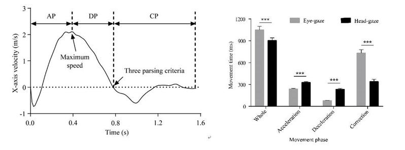 图4. 小球移动过程在x轴上的速度轨迹示例以及加速阶段(Acceleration phase, AP)、减速阶段(Deceleration phase, DP)和调整阶段(Correction phase, CP)划分标准(左);头控和眼控在总时间及三阶段操作时间上的差异(右)。