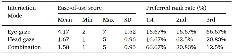 表1. 被试对三种交互方式的难度评分和主观偏好排序