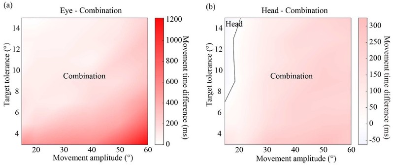 图6. 眼控-头控结合方式与独立的眼控(a)和头控(b)的总操作时间差异热图