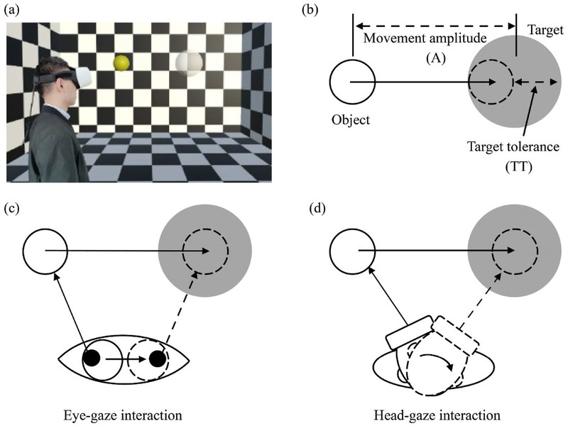 图2. 实验仪器和刺激场景。(a)佩戴内置眼球追踪功能的FOVE 头盔的被试在VR刺激场景中,黄色小球是需要被移动的物体,白色半透明小球是目标区域。(b)实验中两个自变量:移动距离(Movement amplitude, A)和目标容差(Target tolerance, TT)。(c)眼控交互的图示。(d)头控交互的图示。