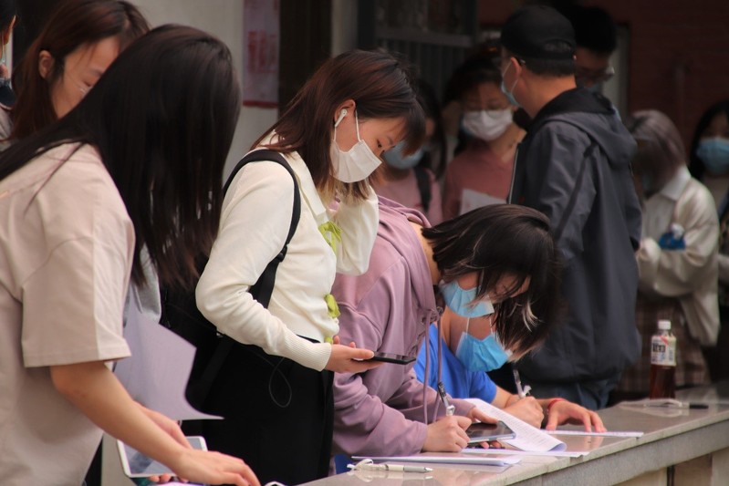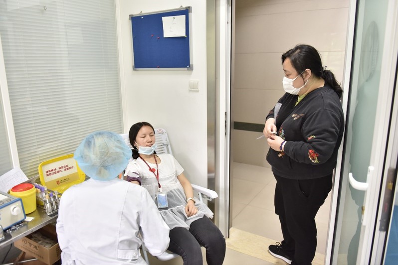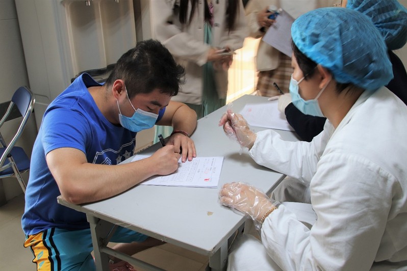 中午,参与献血的同学们在校医院有序排队,依次进行信息登记、血液类型检验、静脉采血等环节。