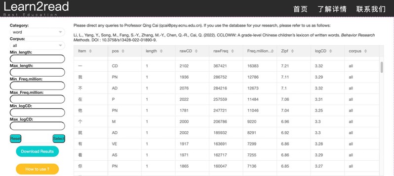 为了方便研究者、家长和教育工作者使用,促进汉语儿童阅读的研究与实践更好地发展,我们已将CCLOWW进行了公开线上发布(https://www.learn2read.cn/database/)。用户可根据需要,选择分级的子数据库或完整数据库 (Corpus),字、词或词元 (Category),词长 (length)、字词频 (Freq.million)、上下文多样(logCD)的分布范围,进行字词语言数据的搜索和下载。搜索页面提供了对以上选项的说明 (How to use)。在论文中,对上述指标进行了更详细的介绍和特征数据分布情况的分析。CCLOWW数据库后续将纳入更多的字词语言特征指标,如语义丰富度、语义多样性、句法分析等。