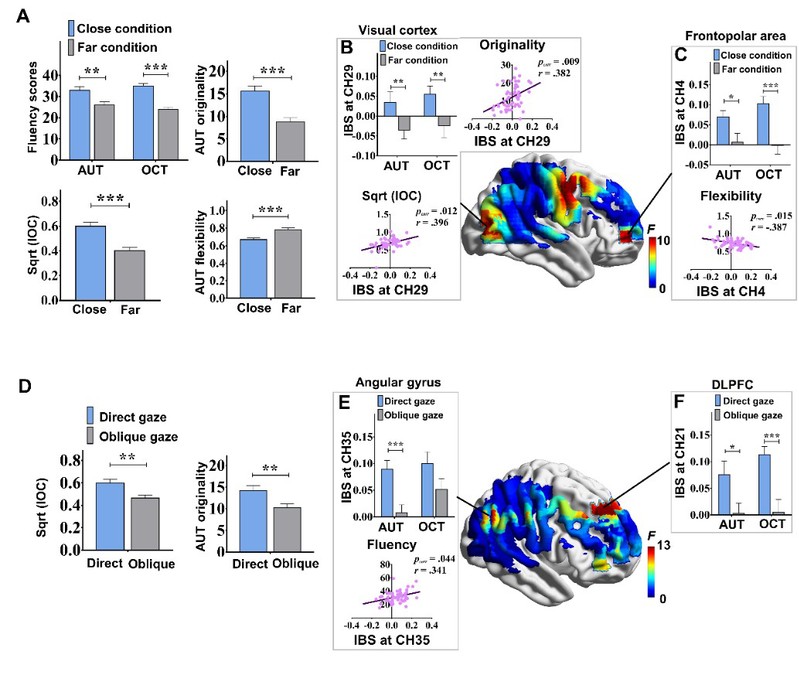 近日,6686体育心理与认知科学学院郝宁教授团队采用基于近红外功能成像的超扫描技术,探索了空间距离、注视角度等非言语要素对创造性交流的影响及效应背后的脑间神经互动机制。研究包括两个实验。实验一中,108被试组成54个两人小队,随机分入远距离组与近距离组,每组各27队。实验二中,110被试组成55个两人小队,随机分入直视组与侧视组,直视组27队,侧视组28队。每组被试均需通过言语交流完成创造性观念生成任务(非常规用途任务)与作为对照任务的记忆提取任务(物体特征任务)。实验过程中,使用近红外功能成像设备同时记录两名被试前额叶与右侧颞顶联合区的脑活动水平。通过比较远/近距离组,及直视/侧视组在行为表现、脑间神经耦合水平(IBS)和多脑网络参数上的差异,探索空间距离与注视角度对创造性交流效果的影响及其背后的脑间神经互动机制。