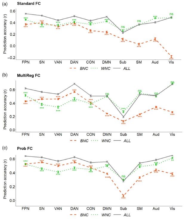 图4:基于三种不同的活动流路径(a,皮尔逊相关方法;b,多元回归方法;c,概率功能连接方法),脑区的网络内和网络间功能连接对活动流预测能力的贡献。