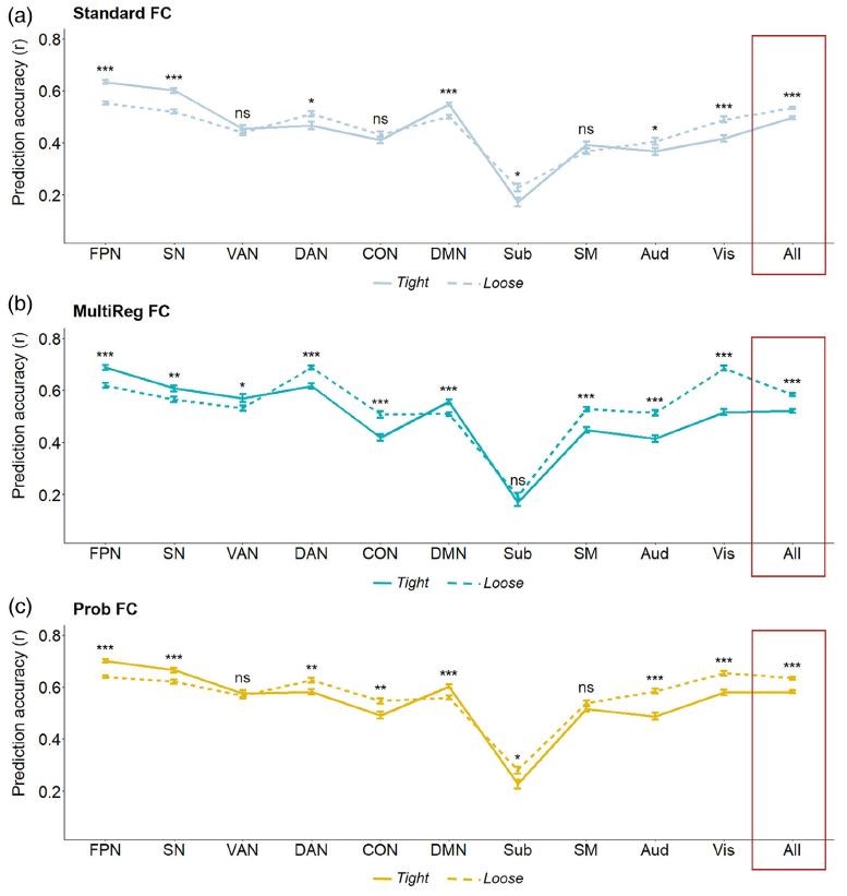 图3:在全脑(All)和单个功能网络水平统计比较使用不同活动流路径的预测准确性。(a)和(b)分别基于4个和1个run的静息态数据构建的活动流路径。