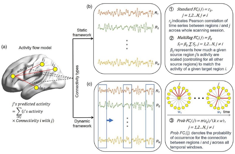 图1:方法学示意图。(a)活动流模型及不同连接路径类型;(b)基于稳态脑网络框架的皮尔逊相关和多元回归功能连接方法;(c)基于动态脑网络框架的概率功能连接方法。