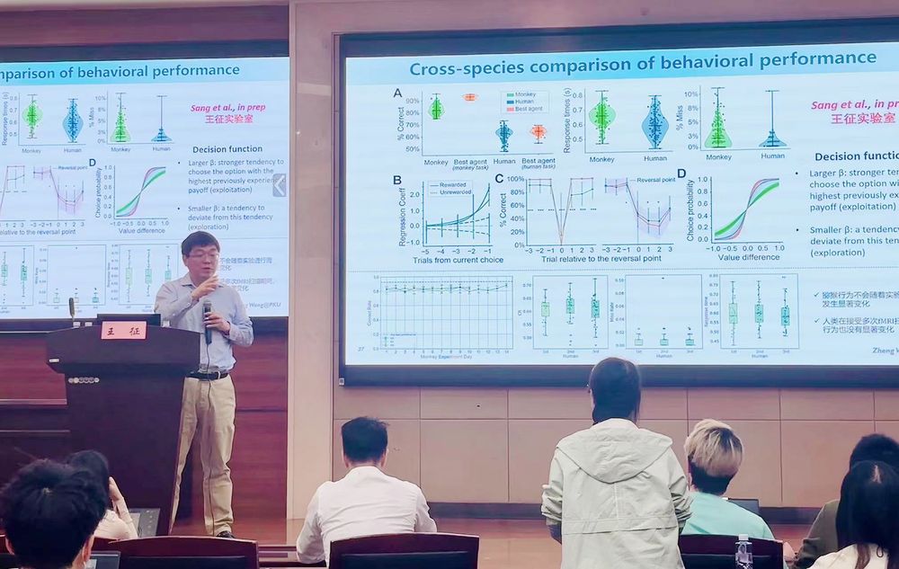 王征老师在报告中系统梳理了认知灵活性的概念内涵与研究进展,对比分析鸽子、蜥蜴、蜜蜂、蜘蛛、蝙蝠以及灵长类动物在反转学习任务中的行为特征,特别以大猩猩的概率性反转学习为例,揭示了其能够依据历史选择信息(即"记忆痕迹")进行当前决策的复杂认知策略。基于这些实证发现,研究聚焦于一个关键科学问题:不同灵长类物种在动态环境中如何通过"探索-利用"权衡机制实现认知灵活性的决策优化,及其神经机制是否具有跨物种一致性。王征老师团队通过整合猕猴-人类统一行为学任务、强化学习建模和任务态功能磁共振成像的多模态研究范式,深度解析了决策过程中的隐变量表征,构建了可解释的神经计算模型来预测个体的单试次选择决策行为,鉴别了影响灵长类选择决策行为差异的关键脑区。研究发现,猕猴在决策中更倾向探索新选项,而人类更善于利用已知规则,决策策略差异可能与前额叶、纹状体等脑区的功能演化有关。研究不仅为类脑智能的决策算法优化提供了生物原型,也为理解智能决策的生物学基础开辟了新的方向。