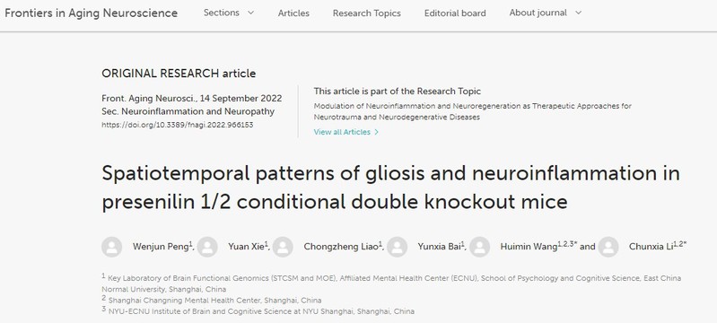 Peng, W., Xie, Y., Liao, C., Bai ,Y., Wang, H.*, Li, C. *(2022). Spatiotemporal patterns of gliosis and neuroinflammation in presenilin 1/2 conditional double knockout mice. Frontiers In Aging Neuroscience. online published. doi: 10.3389/fnagi.2022.966153/full.