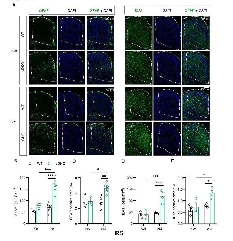 图2.二月龄早发性AD模型动物压后皮层(RS)星形胶质细胞和小胶质细胞的数量均增加