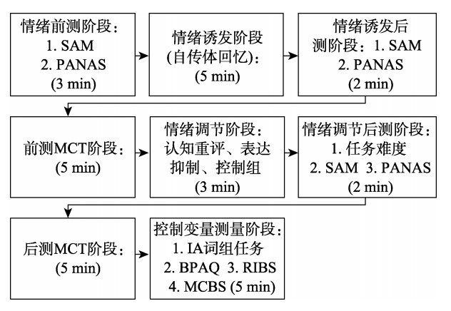实验2招募了120名大学生受试者,将受试者随机分入认知重评、表达抑制和控制组。性别比例在3组之间平衡(每组女性均为30人, 男性均为10人)。受试者通过完成时长5分钟的自传体回忆任务诱发愤怒情绪。情绪诱发后, 受试者完成后测SAM和PANAS, 以及1个前测恶意创造力任务 (5分钟)。而后, 在情绪调节阶段, 认知重评组和表达抑制组受试者使用对应情绪调节策略对愤怒情绪进行调节(3分钟); 控制组受试者仅完成抄写任务(3分钟)。情绪调节后, 受试者完成情绪调节任务难度自评、后测SAM和PANAS, 以及1个后测恶意创造力任务 (5分钟)。最后, 受试者完成偏好组词任务、BPAQ、RIBS和MCBS(详情见图3)。