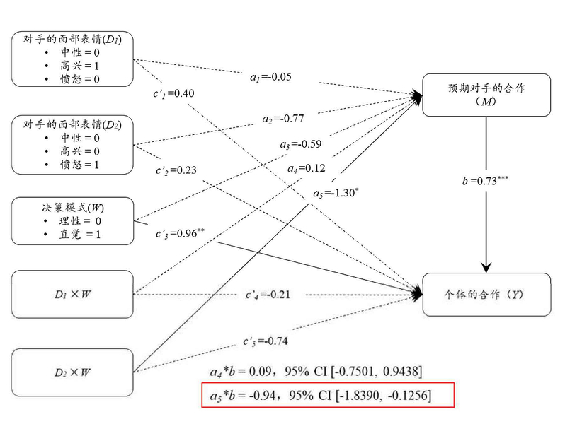 为了考察当事人的决策模式或信息加工方式是否会调节偶然性情绪信息的作用,在实验2和3中,分别采用指导语和时间压力操纵决策模式, 以反复考察何种决策模式下人们更容易受对手偶然性情绪信息的影响。两个实验一致表明,直觉决策模式下,偶然性情绪信息对对手合作预期及行为的影响更强、更大。具体而言,在实验2中, 在直觉决策模式下, 高兴和中性表情组的合作水平显著高于愤怒面部表情组的合作水平, 被试预期高兴和中性表情对手的合作水平显著高于愤怒面部表情对手的合作水平, 且仅在直觉决策模式条件下, 被试对对手合作行为的预期中介了愤怒表情(vs. 中性表情)对个体合作行为的作用。在实验3中, 在时间约束条件下, 高兴面部表情组的合作水平显著高于中性和愤怒面部表情组的合作水平, 被试预期高兴面部表情对手的合作水平显著高于中性和愤怒面部表情对手的合作水平, 且仅在时间约束条件下, 被试对对手合作的预期中介了高兴面部表情(vs. 中性表情)对个体合作行为的效应(参见图4、5、7、8)。