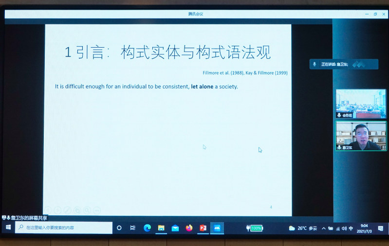 通过线上方式,北京大学中文系教授詹卫东介绍了北京大学中国语言学研究中心近年来开展的构式知识库建设和构式语料标注的语言知识工程实践。詹卫东提到,构式知识等语言数据资源应跟已有的知识资源整合,才能更有效地提供语言知识服务。