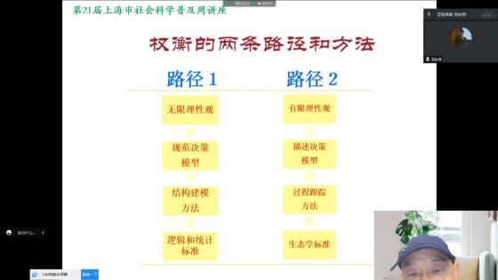 2022年10月15日,6686体育心理与认知科学学院刘永芳教授受邀,在上海市社会科学联合会组织的“第21届上海市社会科学普及活动周”上,面向广大市民作了题为“理性决策与有限理性决策”的主题报告。本次报告通过腾讯会议和小鹅通平台同步直播,来自全国各地的700余人线上参加了报告会。