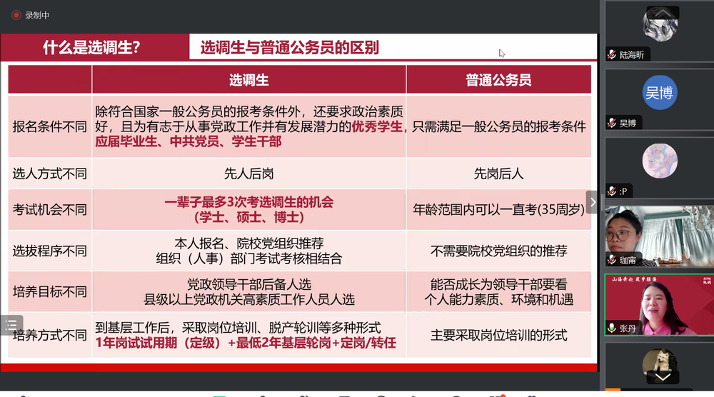 会上,选调办张丹老师向大家详细介绍了选调生的概念、成为选调生的硬性标准、选调生与公务员的区别等。她强调选调生和公务员都是为人民服务的岗位,十分看重基层经验和服务百姓的真挚感情,鼓励大家走进基层走进社会。同时,张老师还系统介绍了报考选调生时要及时关注各地各岗对选调生年龄、经历等的不同要求。